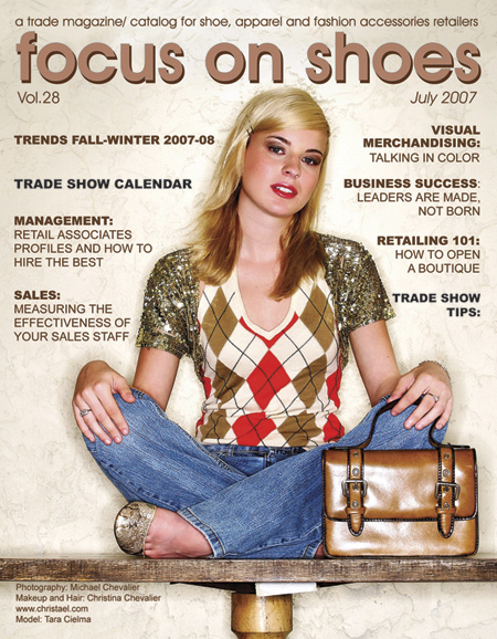 July 2007 issue features: - FASHION FALL-WINTER 2007-08 Trends In Shoes - VISUAL MERCHANDISING: Talking In Color Studies on how various colors affect consumers in your store - TRADE SHOW CALENDAR (August-October) with Show Ratings and Descriptions - RETAILING 101: How To Open A Boutique Guidelines for new comers in business - MANAGEMENT: Retail Associates Profiles And How To Hire The BEST- a must for a manager or a store/business owner - SALES: Measuring The Effectiveness Of Your Sales Staff Guidelines for management - BUSINESS SUCCESS: Leaders Are Made, Not Born An article on self-improvement and motivation - TRADE SHOW TIPS: Understanding Buyer's Rules And Guidelines- whether you are a buyer or a seller, these rules apply to every professional coming to a trade show! - MARKET PLACE: Wholesale catalog of immediately available merchandise |