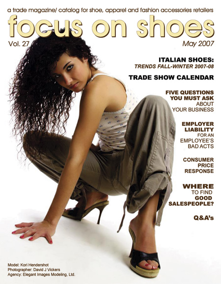 May 2007 issue features: - FASHION FALL-WINTER 2007-08 Trends In Italian Shoes - PRICING: Consumer Price Response Studies on how to establish proper pricing of your merchandise to achieve maximum results - TRADE SHOW CALENDAR (May-July) with Show Ratings and Descriptions - REATAILING 101: Five Questions You Must Ask Your Business... And the ONE That Will Separate You From Competition - MANAGEMENT: Where To Find Good Salespeople? - SALES: Why Are Customers So Resistant? - BUSINESS LAW: Employer Liability For An Employee's Bad Acts - Q&A's: Retail guru James Dion answers questions of Focus on shoes readers - MARKET PLACE: Wholesale catalog of immediately available merchandise |